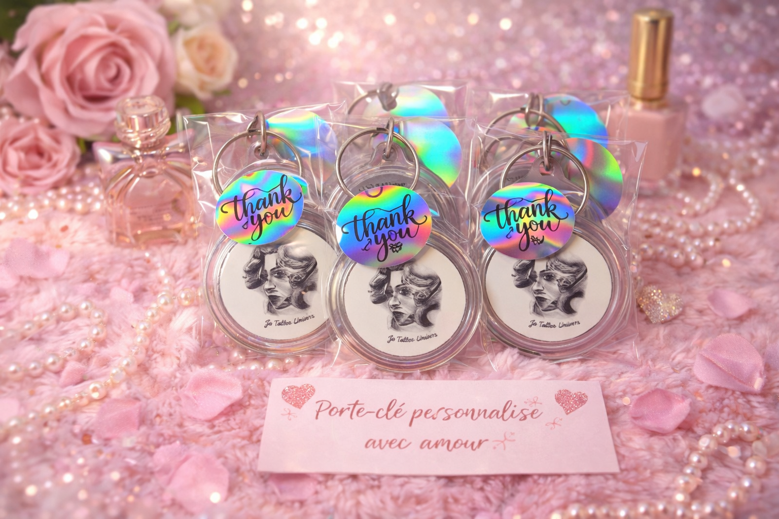 Chaque porte-clé est imprimé avec nos coordonnées complètes (recto) et un visuel de qualité (verso).