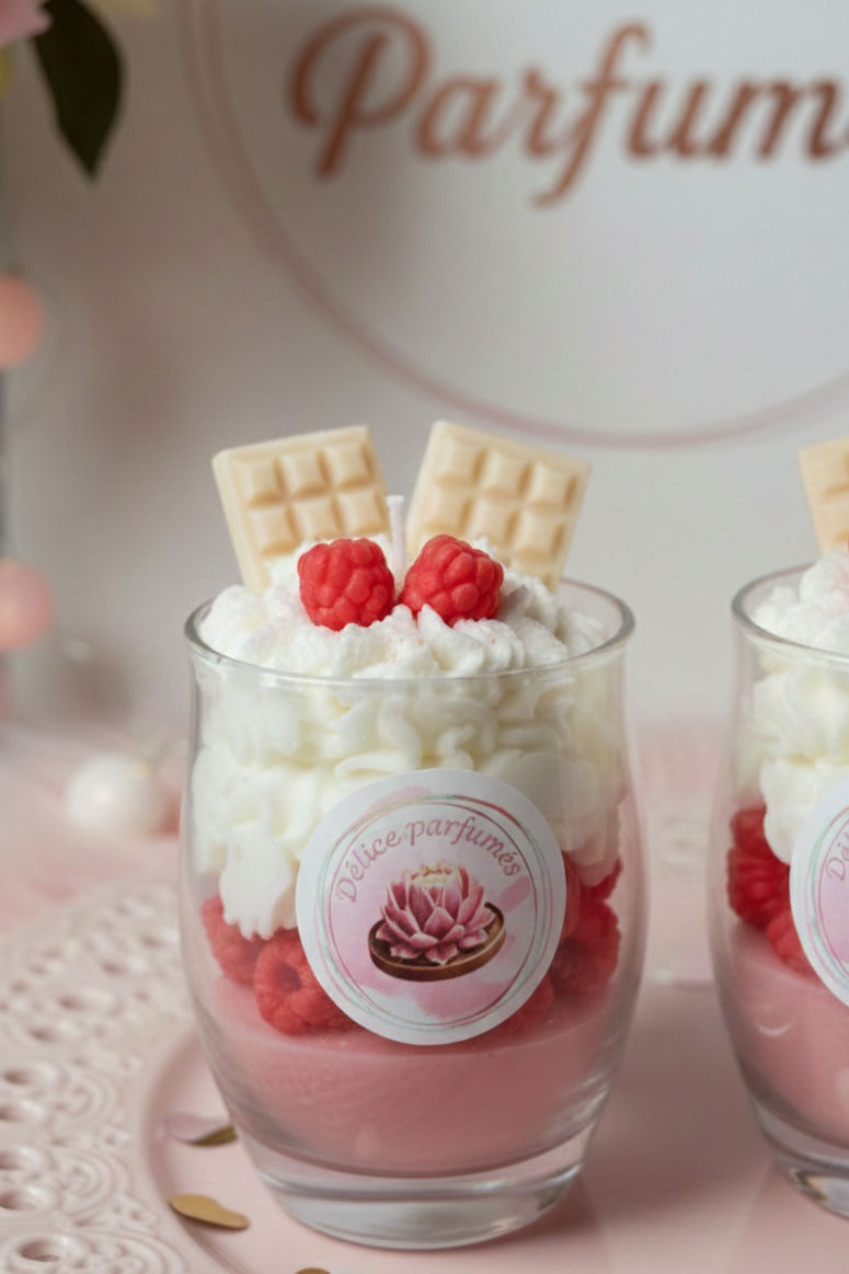 Le Design : Un dessert trompe-l'œil dans son verre, surmonté de fausses framboises et de carrés de chocolat blanc. Une touche d'éclat scintillante pour illuminer votre intérieur, même avant de l'allumer.