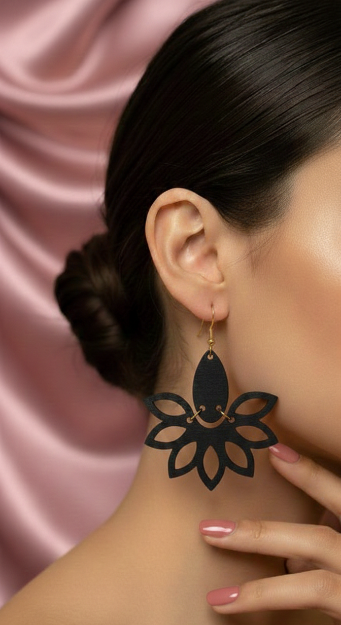 Découvrez nos nouvelles boucles d'oreilles "Lotus Noir". Chaque pièce est d'abord découpée avec la précision du laser pour un design floral parfait, puis peinte à la main avec soin dans mon atelier.