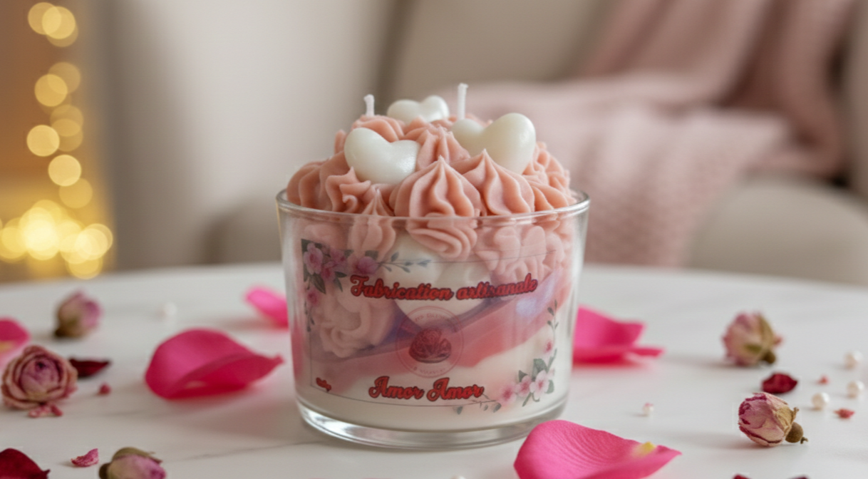 Laissez-vous envoûter par notre bougie "Amor Amor", une création 100 % artisanale pensée comme une véritable déclaration. Avec son décor aérien travaillé à la main et ses délicats cœurs fondants, elle apporte une touche de douceur et de passion à votre intérieur.