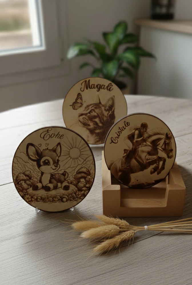 âDécouvrez mes dernières créations : des sous-verre personnalisés, gravés avec soin dans mon atelier. Que ce soit pour immortaliser votre animal préféré, une passion ou simplement pour ajouter une touche unique à votre table, chaque pièce est unique.