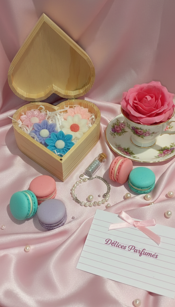 Laissez-vous séduire par notre écrin en bois, un véritable cocon de douceur pour vos sens. Ce coffret en forme de cœur est gravé et entièrement personnalisable, faisant de chaque boîte une pièce unique, aussi belle à regarder qu'à sentir.